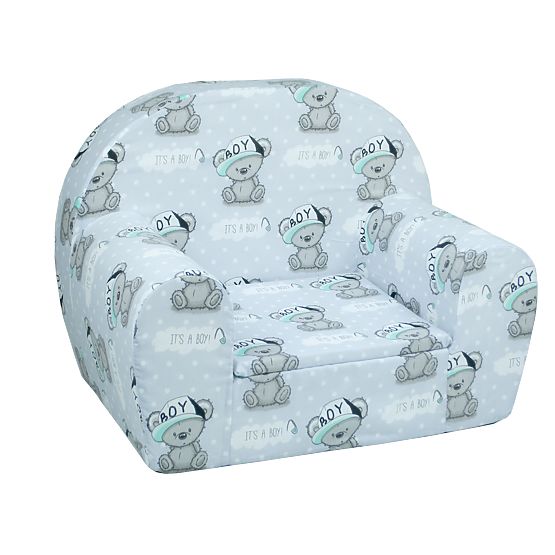 Piękne małe krzesło w szarym kolorze z wizerunkiem pluszowego misia w czapce oraz białymi kropkami i chmurami pokocha każdego małego rapera. Idealne miejsce do oglądania ulubionych bajek i relaksu po męczącym dniu.