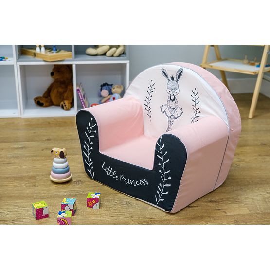 Kolorowy fotel z motywem baletnic króliczków. Ożyw pokój dzięki połączeniu białej i różowej tkaniny, którą dziewczyny pokochają od pierwszego wejrzenia. Na przodzie krzesła znajduje się piękny napis Mała Księżniczka . Fotelik dziecięcy wykonany jest z miękkiej i lekkiej pianki. Dzięki temu jest bezpieczny i praktyczny w codziennym użytkowaniu.