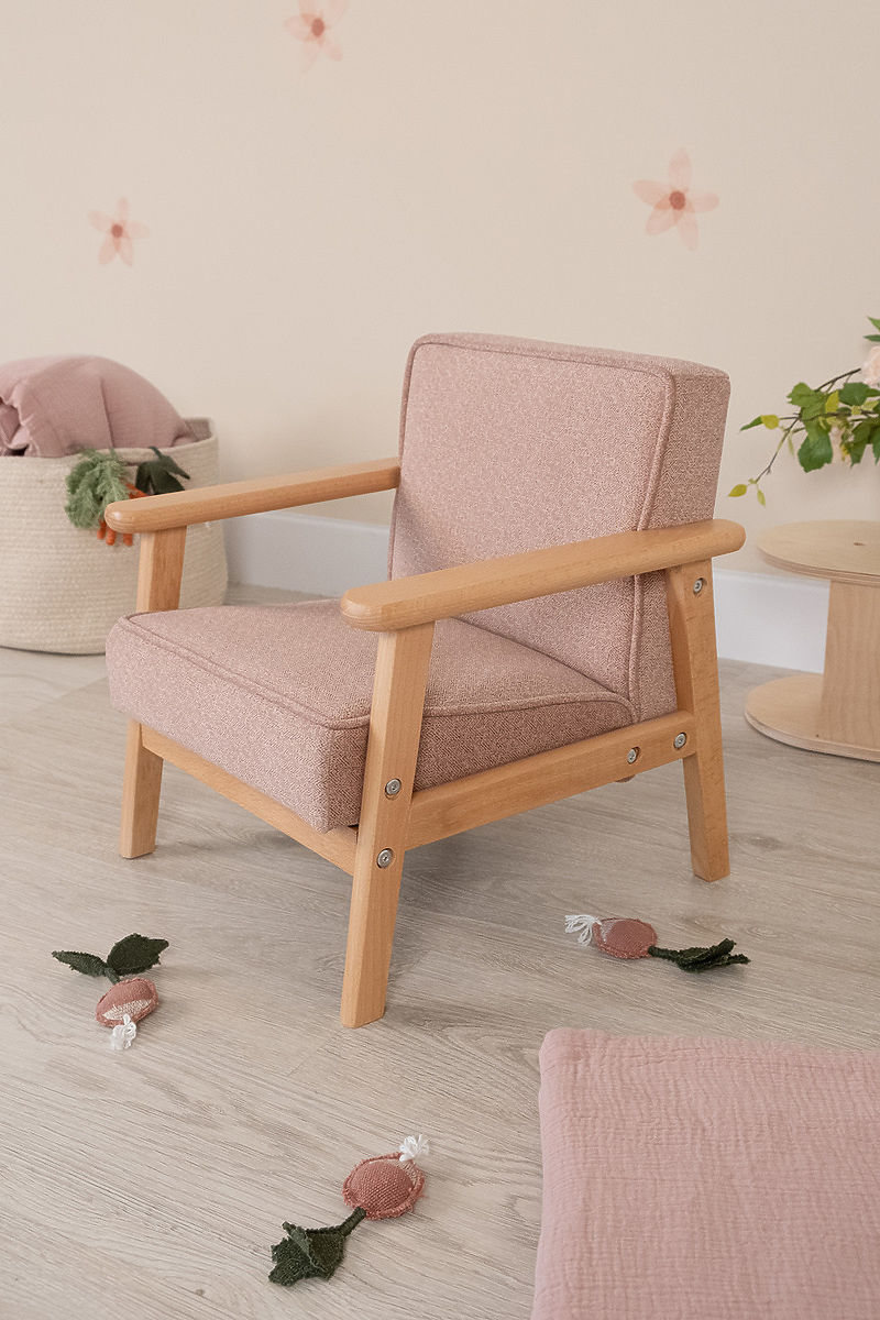 Różowy retro fotelik dla dzieci z wygodnym siedzeniem i solidną drewnianą konstrukcją. .. więcej