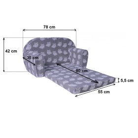 Piękna szara sofa z białymi gwiazdami jest lekka, dzięki czemu nawet dziecko może ją łatwo przesuwać, rozkładać i składać. Nadaje się nie tylko do pokoju dziecięcego, ale także do przedszkoli i kącików dziecięcych.