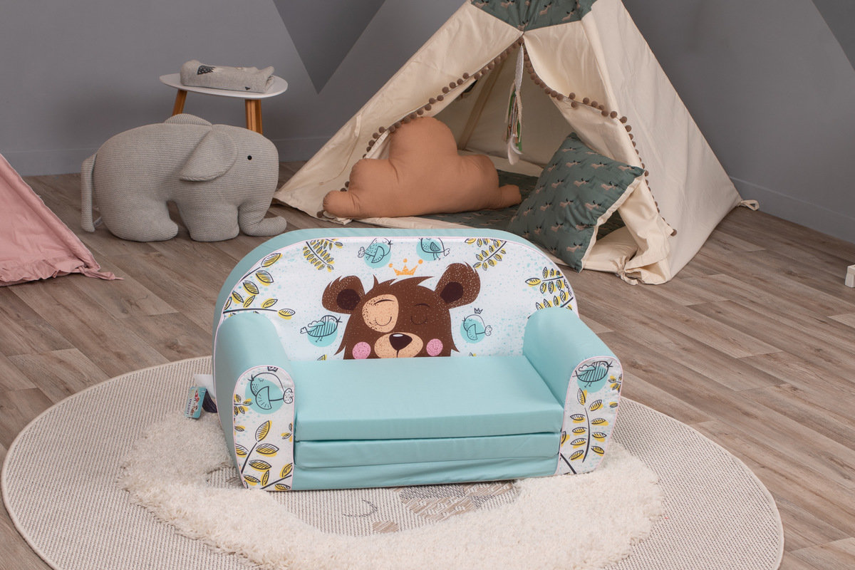 Turkusowa kanapa ze śpiącym misiem. Urocza sofa odpowiednia dla najmłodszych. Sofa dla dzieci wykonana jest z miękkiej i lekkiej pianki. Dzięki temu jest bezpieczny i praktyczny w codziennym użytkowaniu.