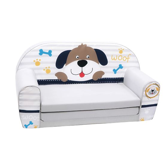 Sofa z psem w uniwersalnym szarym kolorze jest lekka, dzięki czemu można ją łatwo przenosić, rozkładać i składać. Nadaje się nie tylko do szkółek, ale także do szkółek i narożników dla dzieci.