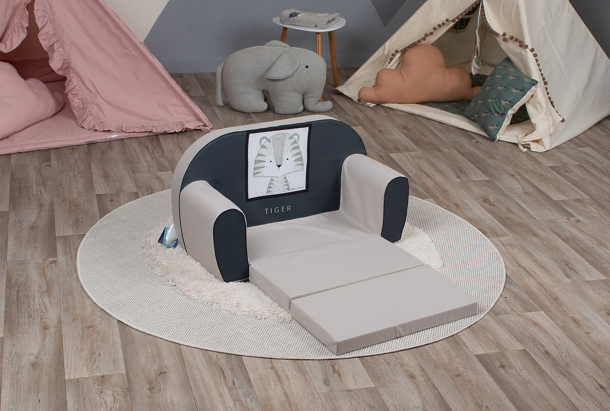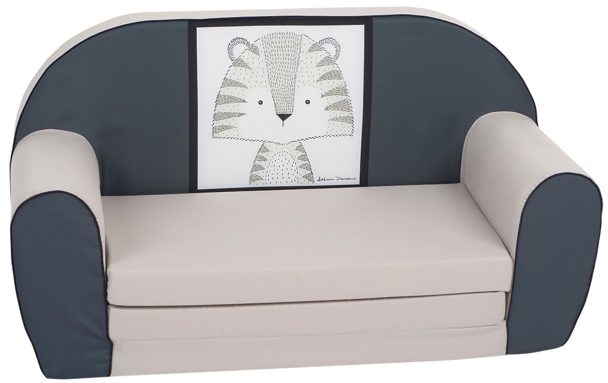Sofa dziecięca z wizerunkiem tygrysa. Tkanina łączy w sobie jaśniejsze i ciemniejsze odcienie szarości i dlatego jest odpowiednia zarówno dla chłopców, jak i dziewczynek. Sofa dla dzieci wykonana jest z miękkiej i lekkiej pianki. Dzięki temu jest bezpieczny i praktyczny w codziennym użytkowaniu.
