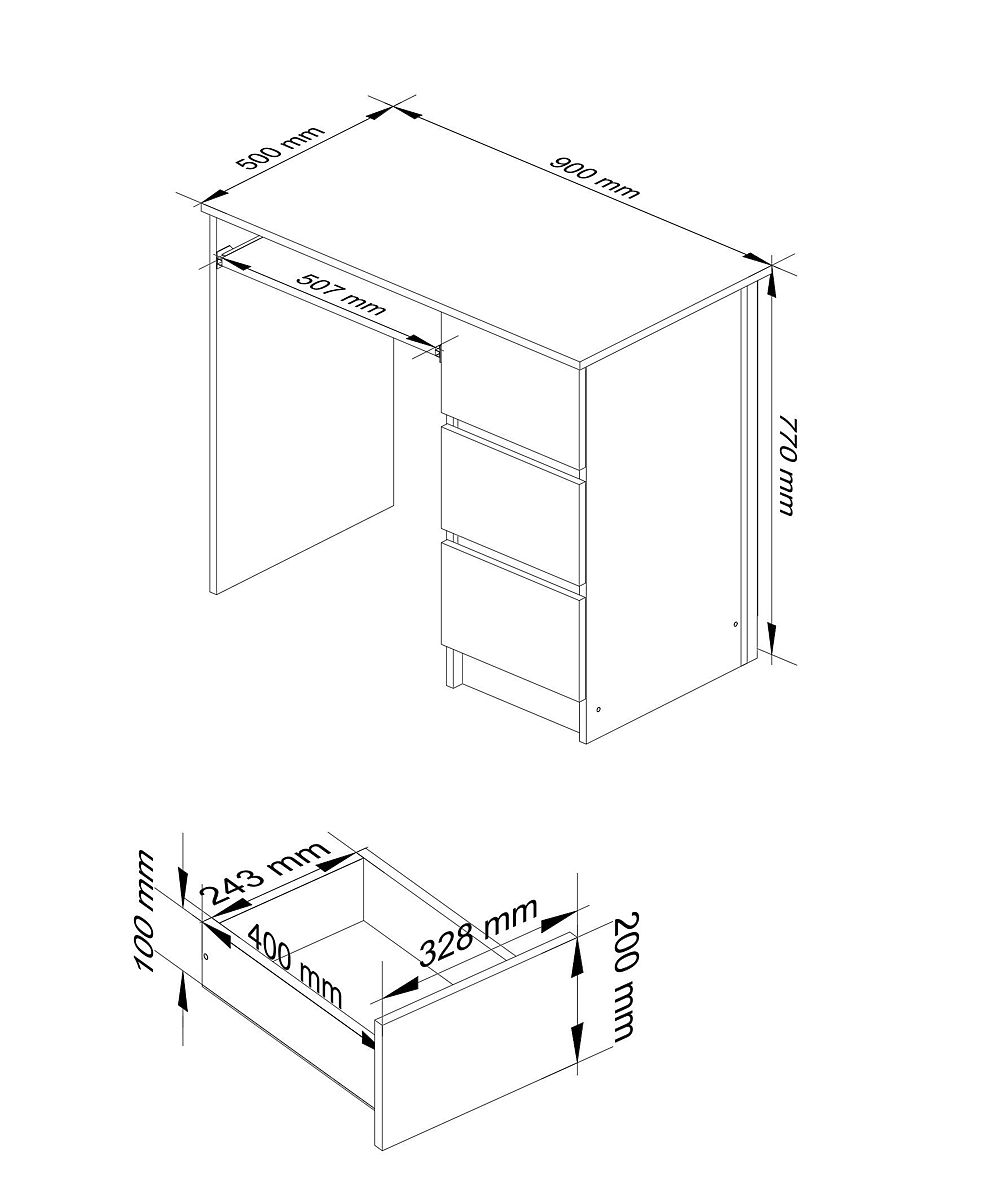 - Szuflady i półka na klawiaturę poruszają się na metalowych prowadnicach rolkowych