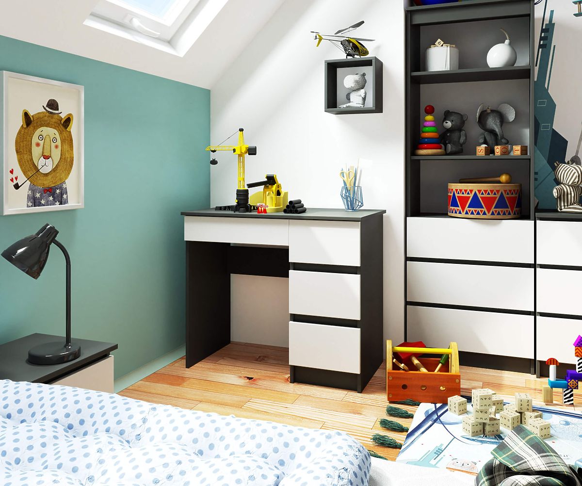 Do biurka można dostosować dodatkowe wyposażenie, takie jak regał, szafa lub stół, dzięki którym możliwe będzie stworzenie funkcjonalnego, ponadczasowego pokoju dziecięcego, młodzieżowego lub domowego gabinetu. Meble z kolekcji łączą solidną konstrukcję, uniwersalny design, wykonanie z dbałością o szczegóły i łatwość codziennego użytkowania.