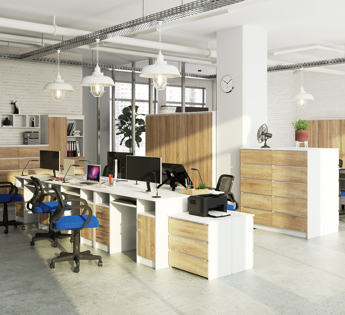 Biurko ANA zostało zaprojektowane z myślą o biurach i gabinetach. Oczywiście doskonale nadaje się również jako biurko studenckie. Klasyczna kombinacja kolorystyczna białego i sonoma pozwala na łatwe dopasowanie do każdego wnętrza. Duża powierzchnia blatu umożliwia dowolne umieszczenie monitora. Klawiaturę można umieścić na wysuwanej półce pod blatem. Biurko oferuje dużą ilość przestrzeni do organizacji, otwarte półki, szuflady i szafkę z półką. Cała konstrukcja wykonana jest z laminowanej płyty odpornej na ścieranie.