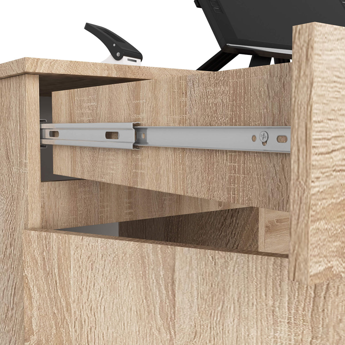 - Szuflady i półka na klawiaturę poruszają się na metalowych prowadnicach kulkowych
