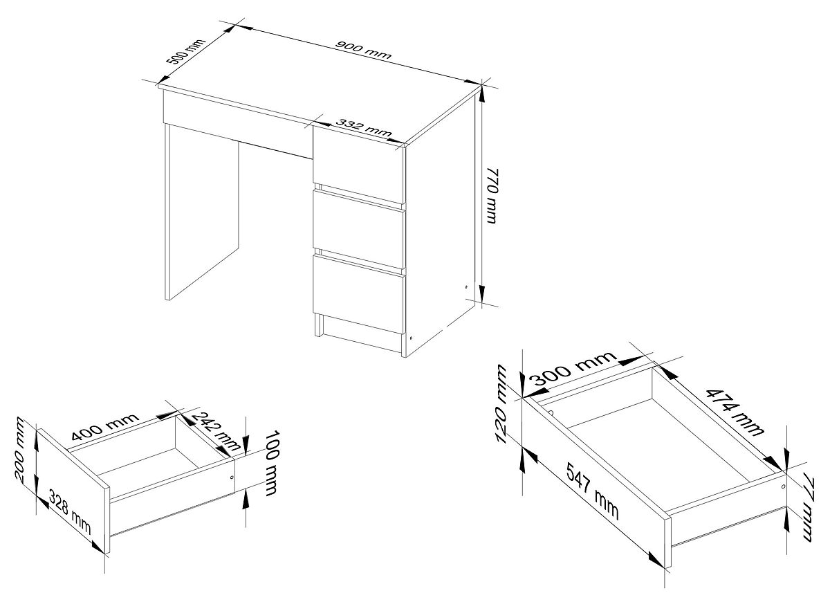 Biurko komputerowe A-7 to mały mebel, który znajdzie zastosowanie w małej przestrzeni - biurowej lub mieszkalnej. Nadaje się na przykład do domowego biura lub pokoju dziecięcego/młodzieżowego. Prezentowany produkt łączy dwie kontrastujące, ale doskonale uzupełniające się kolory - grafitowy szary i biały. Składa się z trzech szuflad przeznaczonych do dowolnego ułożenia. Prosty w formie, ale niezwykle funkcjonalny mebel z pewnością docenią ci, którzy chcą stworzyć kącik do pracy lub nauki, ale nie mają do dyspozycji dużo miejsca.
