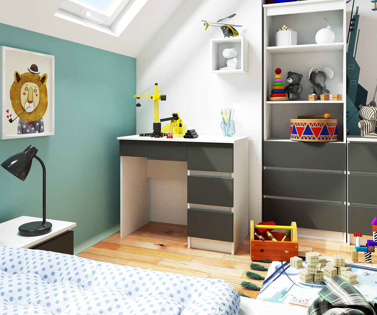 Do biurka można dopasować inne wyposażenie, takie jak regał, szafa lub biurko, co pozwoli stworzyć funkcjonalny, ponadczasowy pokój dziecięcy, młodzieżowy lub domowe biuro. Meble z kolekcji łączą solidną konstrukcję, uniwersalny design, wykonanie z dbałością o detale i łatwość codziennego użytkowania.
