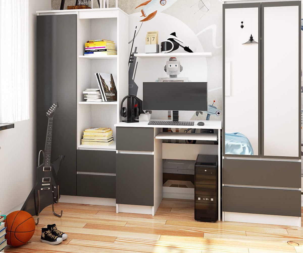Biurko komputerowe PIKSEL białe/grafitowo-szare jest doskonałe do użycia w pokoju dziecięcym, studenckim, a także w sypialni czy salonie, gdzie jest wydzielony kąt do pracy zdalnej lub nauki. Sprawdzi się również w małych przestrzeniach biurowych, gdzie świetnie komponuje się z innymi meblami w systemie bezuchwytowym.