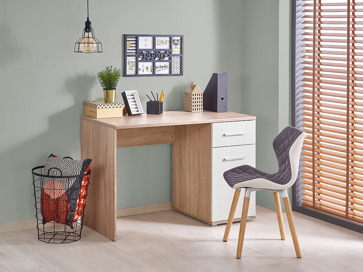 Stylowe biurko w kolorze dąb sonoma/biały, które łączy nowoczesny wygląd i praktyczne właściwości. Wykonane z laminowanej płyty meblowej z krawędziami ABS, jest idealne do efektywnej pracy i organizacji.