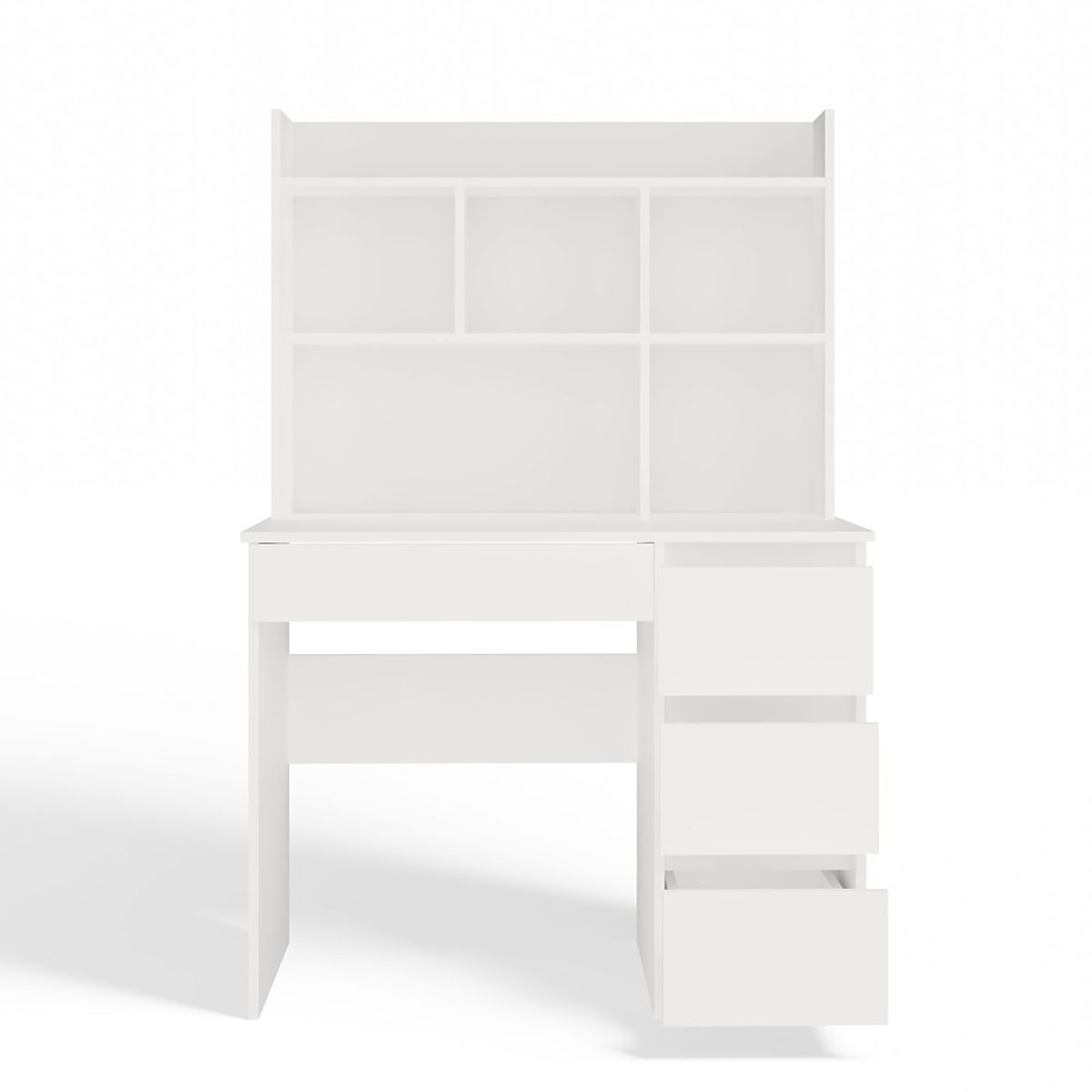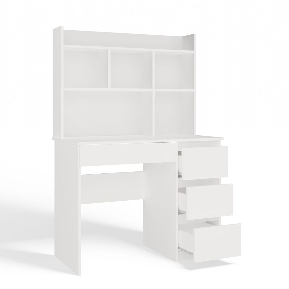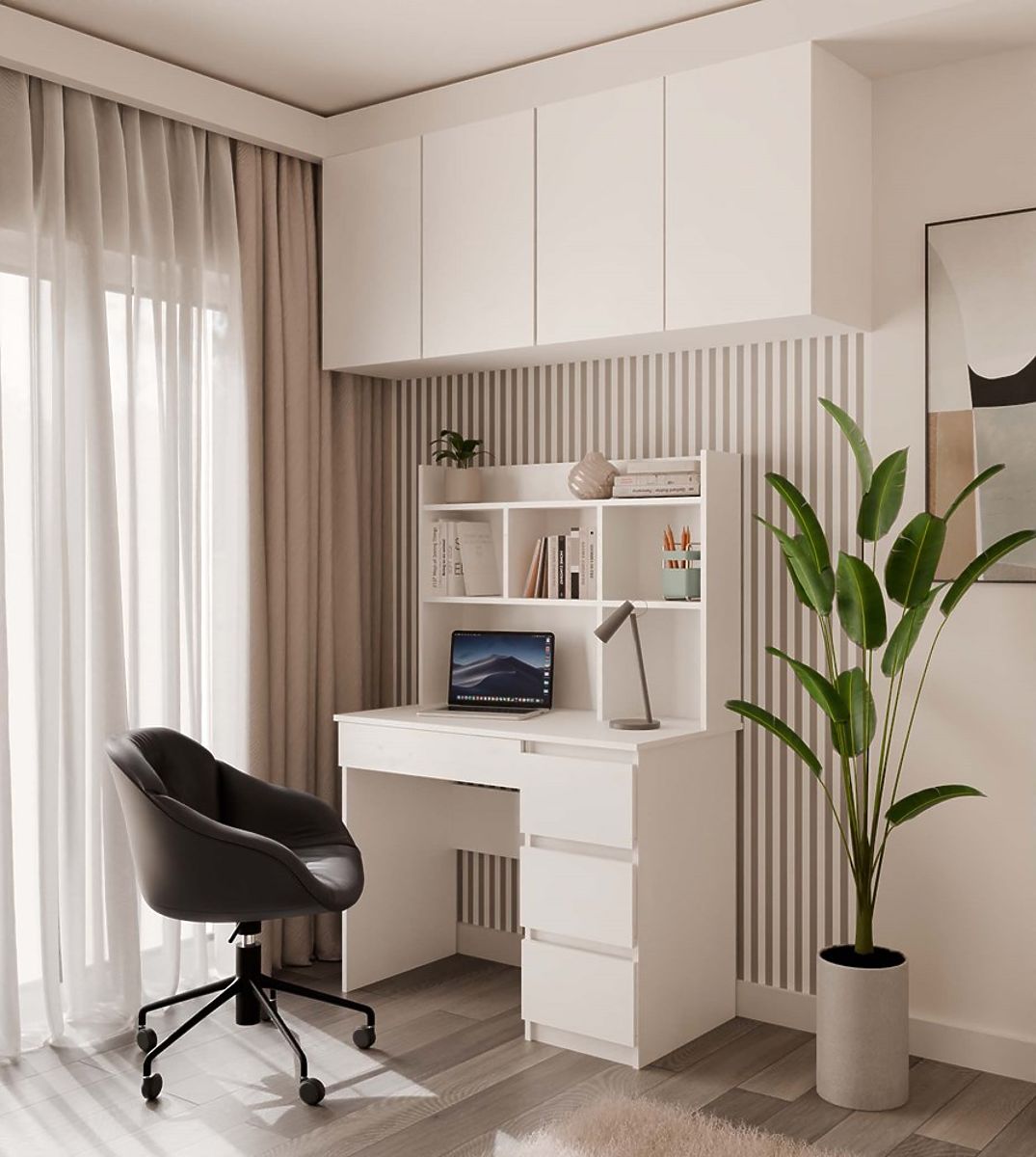 Nowoczesna forma, matowa biel oraz praktyczny układ przechowywania sprawiają, że mebel idealnie odnajdzie się zarówno w pokoju młodzieżowym, dziecięcym, jak i domowym biurze.