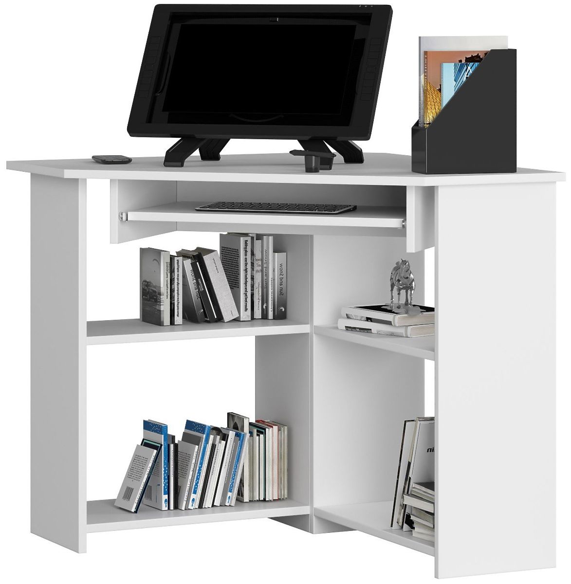 Narożne biurko z białej płyty laminowanej, odporne na ścieranie i uszkodzenia. .. więcej