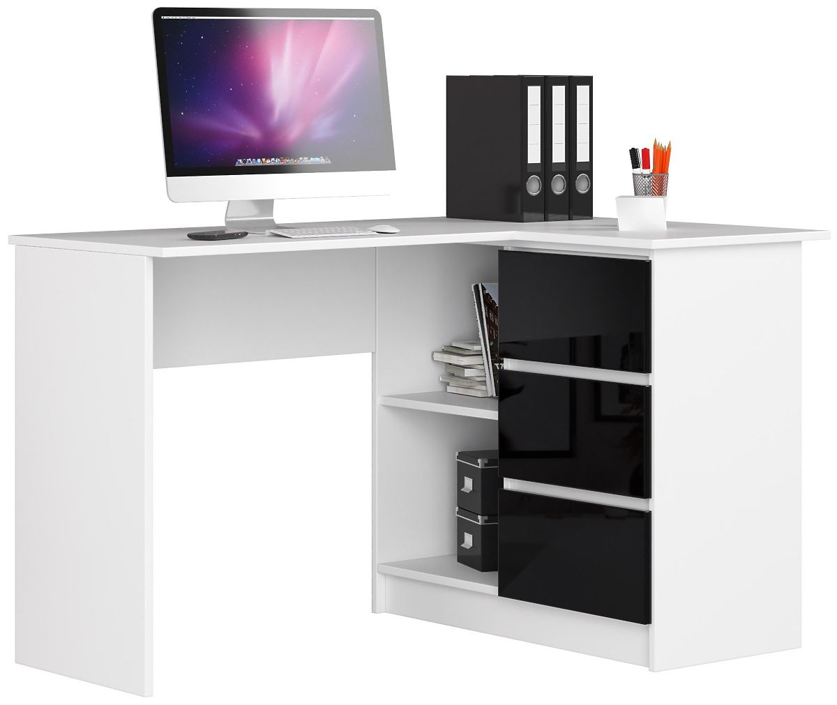 Narożne biurko komputerowe z trzema szufladami i wysokim połyskiem. .. więcej