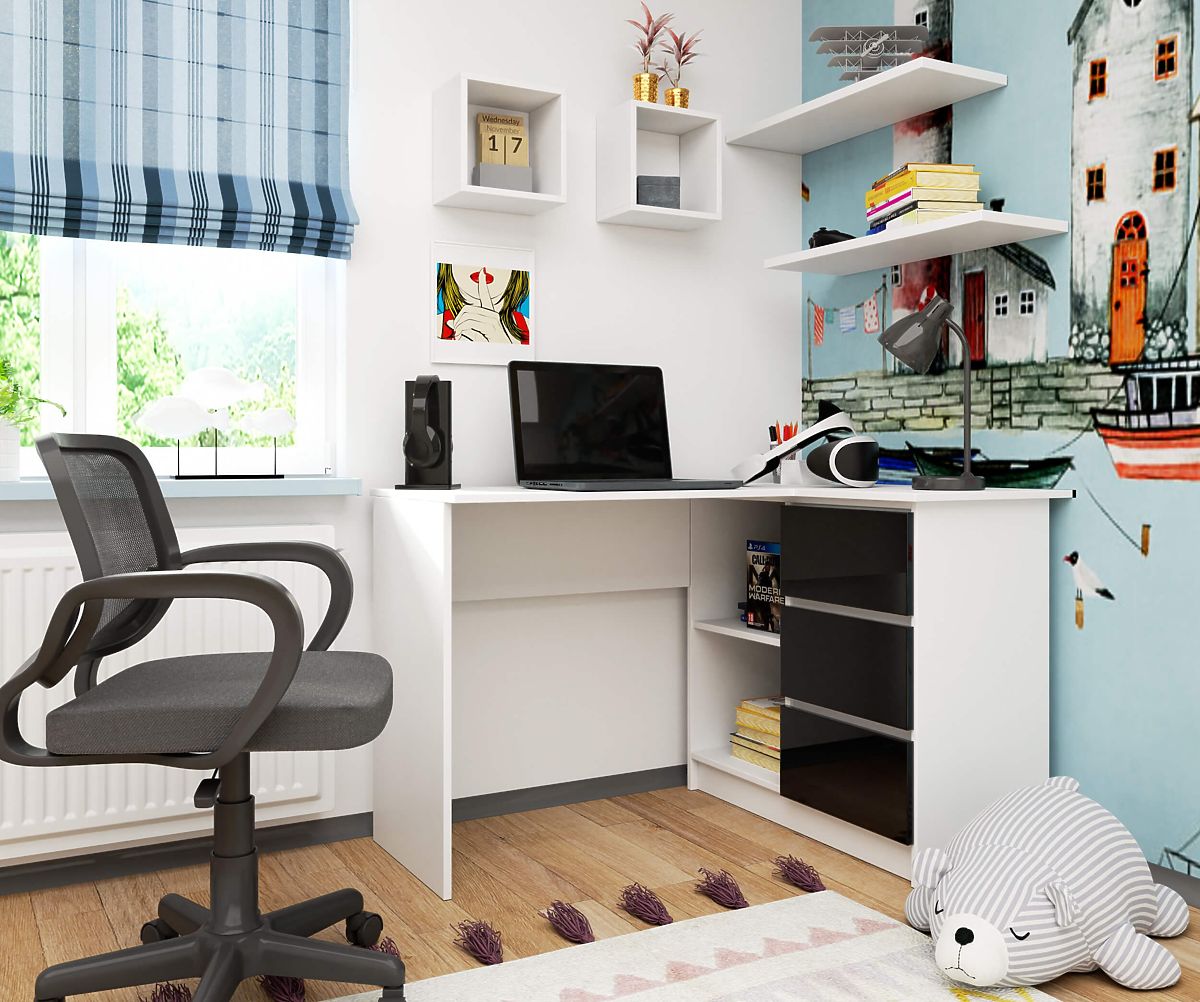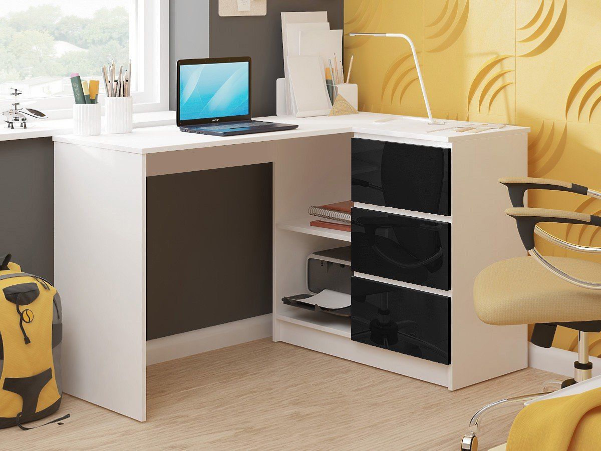 Banaby.pl » Meble dziecięce / Stoliki / Biurka / NAROŻNE BIURKO B16 124 cm PRAWE 3 SZUFLADY PK BIAŁY / CZARNY POŁYSK