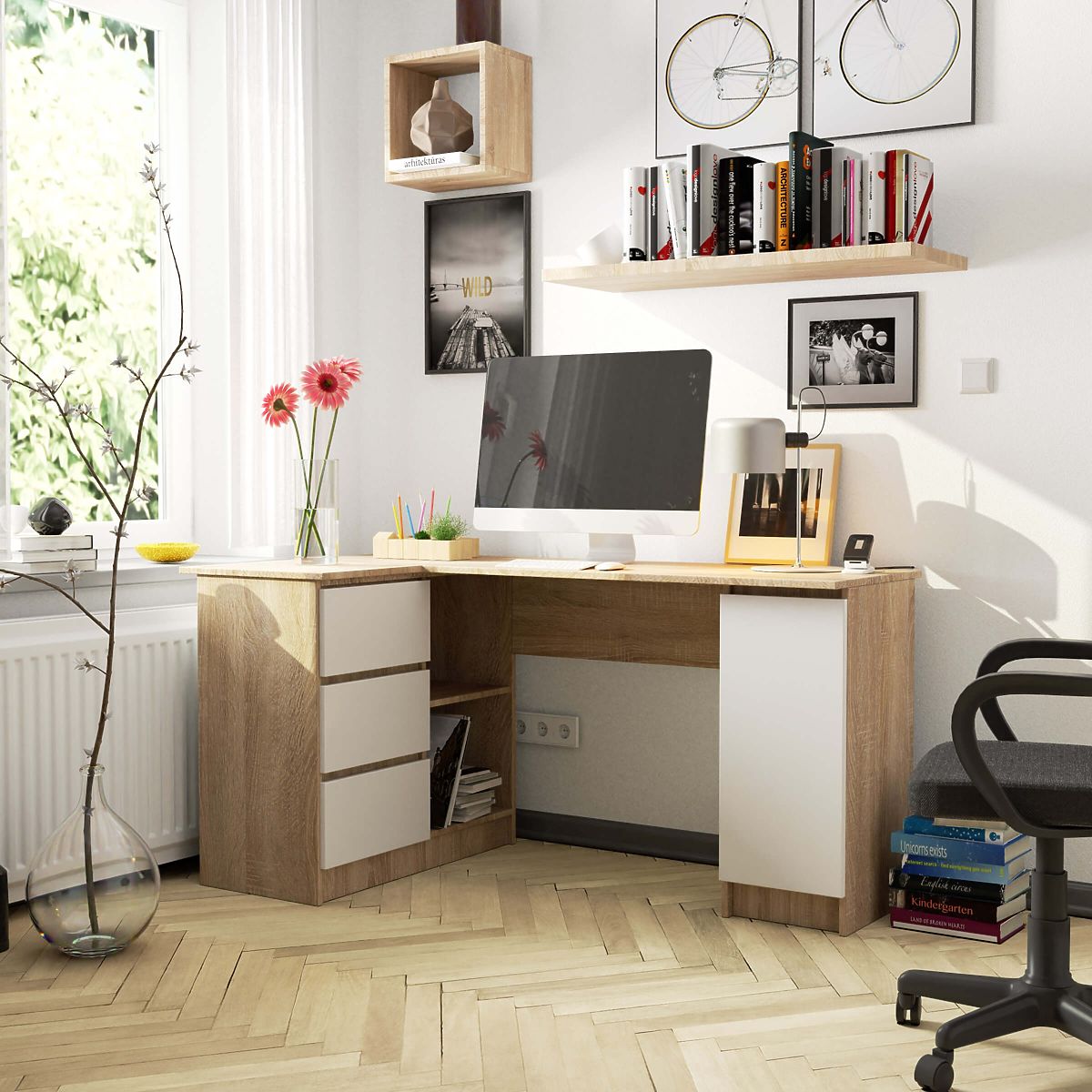 Piękne i funkcjonalne narożne biurko komputerowe z szafką i szufladami to nowoczesny mebel w ulubionej kolorystyce naszych klientów. Połączenie uniwersalnej bieli i bardzo praktycznego dębu sonoma to doskonały wybór dla tych, którzy śledzą aktualne trendy i chcą stworzyć efektywne i funkcjonalne miejsce pracy. Narożne biurko doskonale wykorzystuje przestrzeń i jednocześnie zapewnia w pełni komfortowe miejsce do pracy. Jest wyposażone w długi blat oraz liczne szafki i szuflady, w których można przechowywać niezbędne drobiazgi na stanowisku pracy. Mebel wykonany jest z płyty laminowanej o grubości 16 milimetrów, która wykazuje wysoką odporność na ścieranie. Widoczne krawędzie są oklejone obrzeżem ABS o zwiększonej odporności na uszkodzenia. Wymiary biurka to 155 cm x 77 cm x 85 cm. Narożne biurko dąb sonoma to połączenie solidnej konstrukcji, nowoczesnego designu i funkcjonalności w każdym detalu, które jest na wyciągnięcie ręki za atrakcyjną cenę.