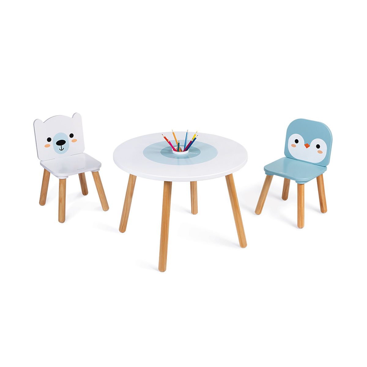 Drewniany stolik z krzesełkami dla dzieci od Janod z motywami zwierząt polarnych jest świetnym dodatkiem do każdego pokoju dziecięcego. Na jednym krzesełku jest niedźwiedź polarny, na drugim pingwin.