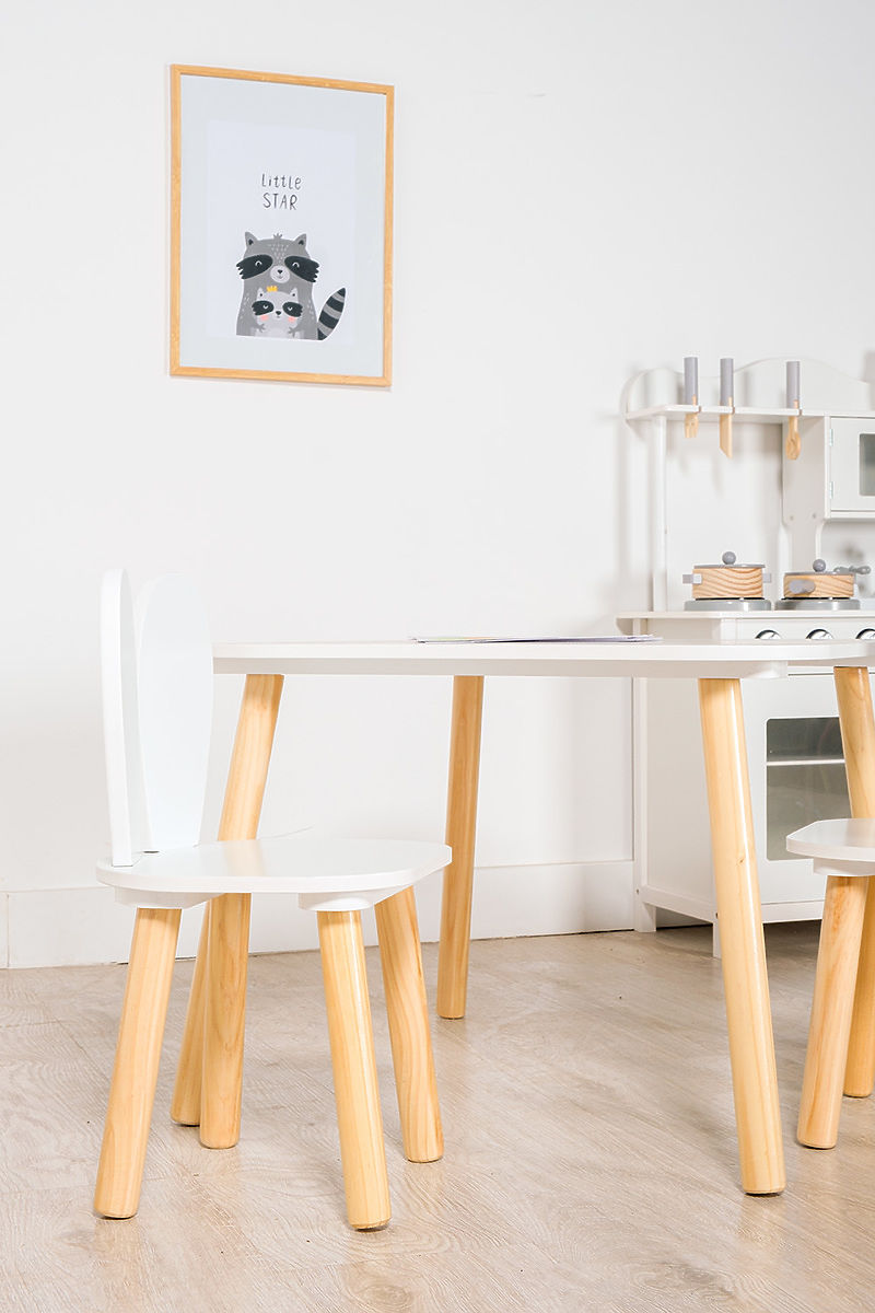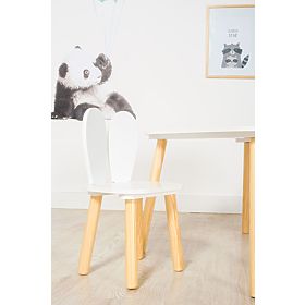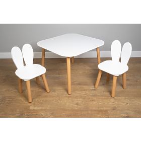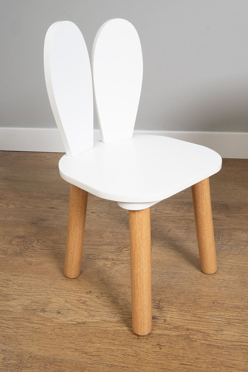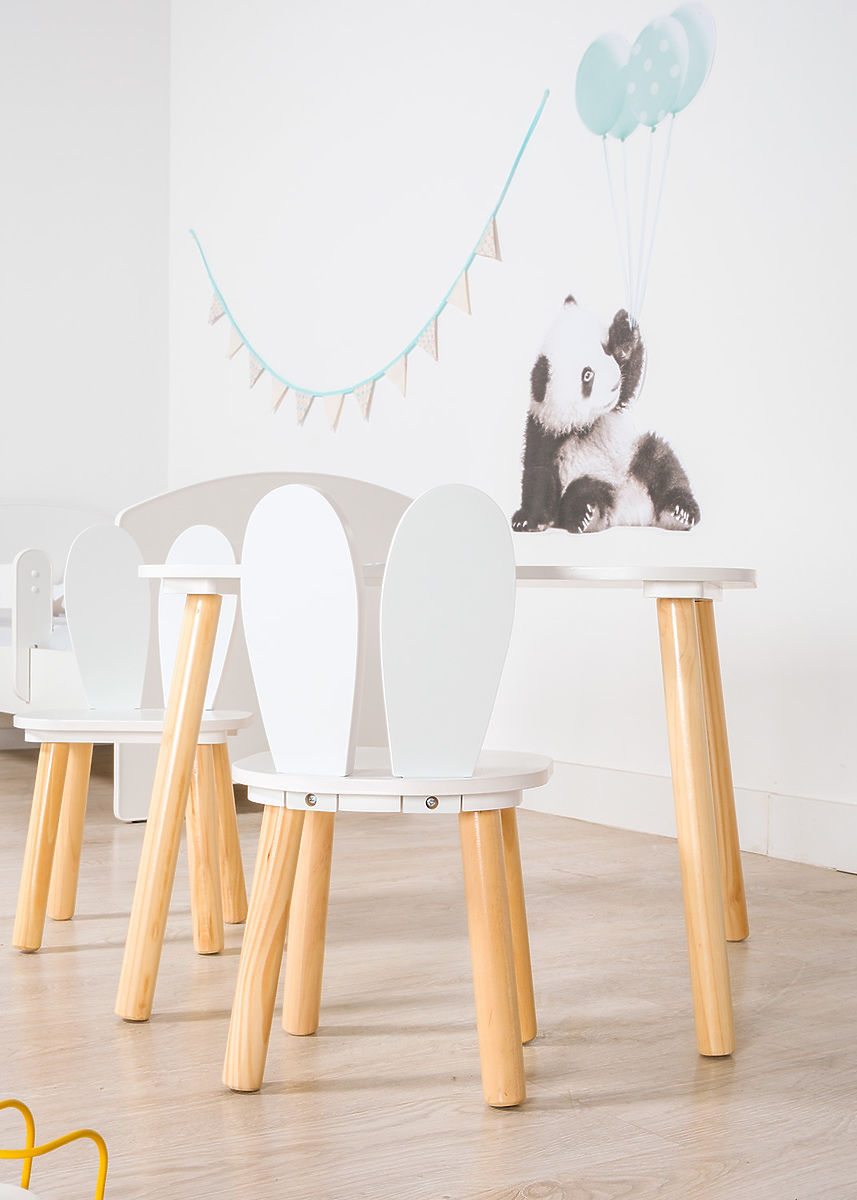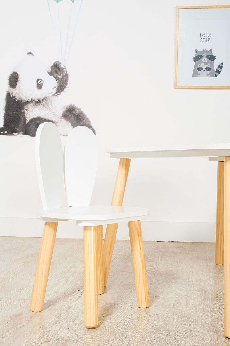 Dziecięcy stolik i 2 krzesełka w połączeniu białego koloru i naturalnego drewna. Zestaw mebli ożywi pokoje zarówno dla chłopców, jak i dziewczynek. Krzesełka z uszami przypominają króliki i wyglądają uroczo.