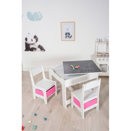 Piękny stolik z krzesłami znajdzie zastosowanie w każdym dziecięcym pokoju. Oferuje zmienną powierzchnię stołu, która może przekształcić się w czarną tablicę kredową. Praktyczne pudełka w różowym kolorze zapewnią dodatkową przestrzeń do przechowywania.