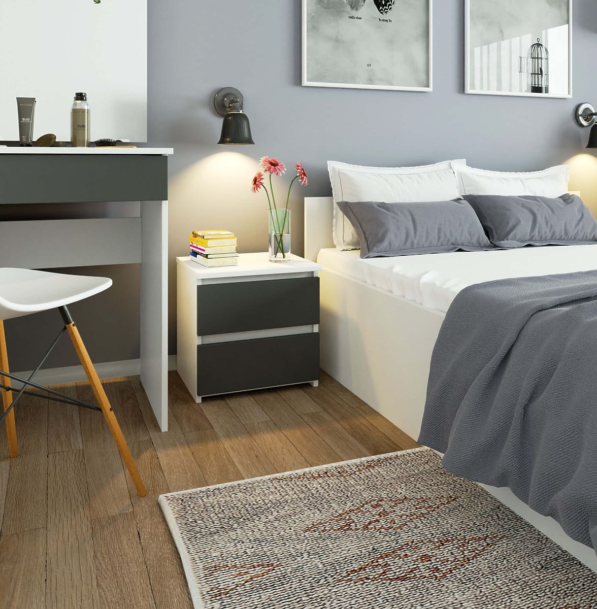 Szafki nocne to popularny rodzaj mebli, które umieszcza się obok łóżka. Na blacie można postawić lampkę, a w szufladach przechowywać ważne przedmioty, które poprawiają jakość odpoczynku i snu. W naszej ofercie dostępna jest biała szafka nocna CL2 40 cm z frontami szuflad w kolorze grafitowej szarości. Prezentuje się elegancko i nowocześnie, a jednocześnie jest funkcjonalna. Doskonale pasuje do każdej sypialni i pokoju młodzieżowego.