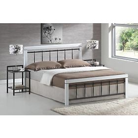 Interesujące połączenie metalu i drewnie. Naturalne drewno jest biały. Rama jest metalowy, jak również przednią i tylną część złoża. kolor ramki jest czarny. Siatka jest częścią łóżka, bez materaca.