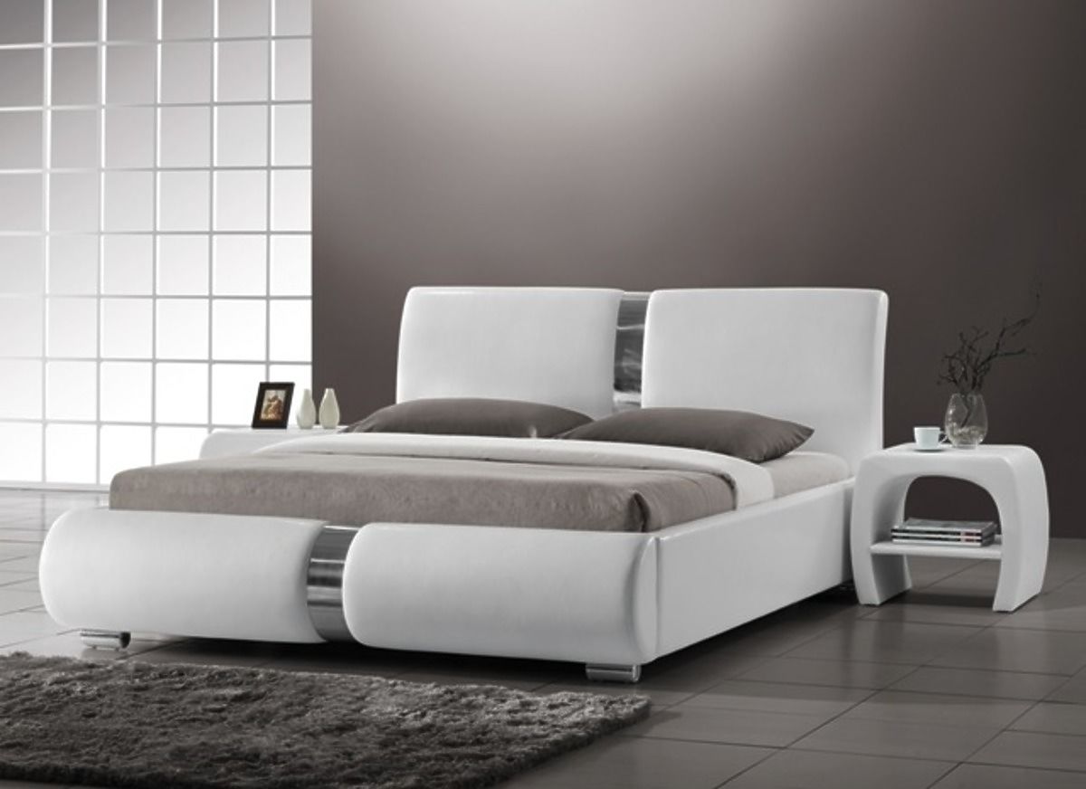 Nowoczesne i luksusowe łóżko Tokyo z ekoskóry w białym kolorze z detalami matelowymi w kolorze chromu.