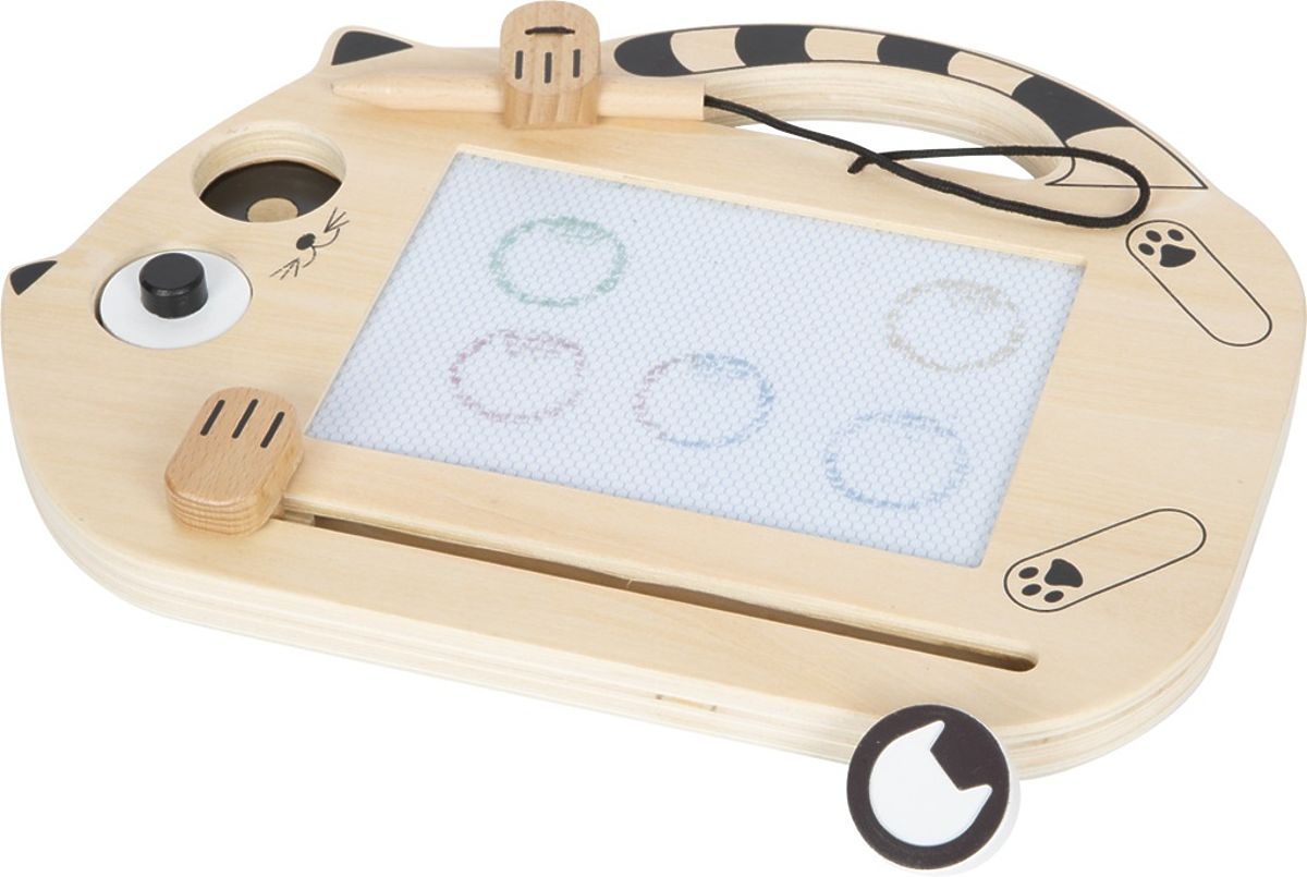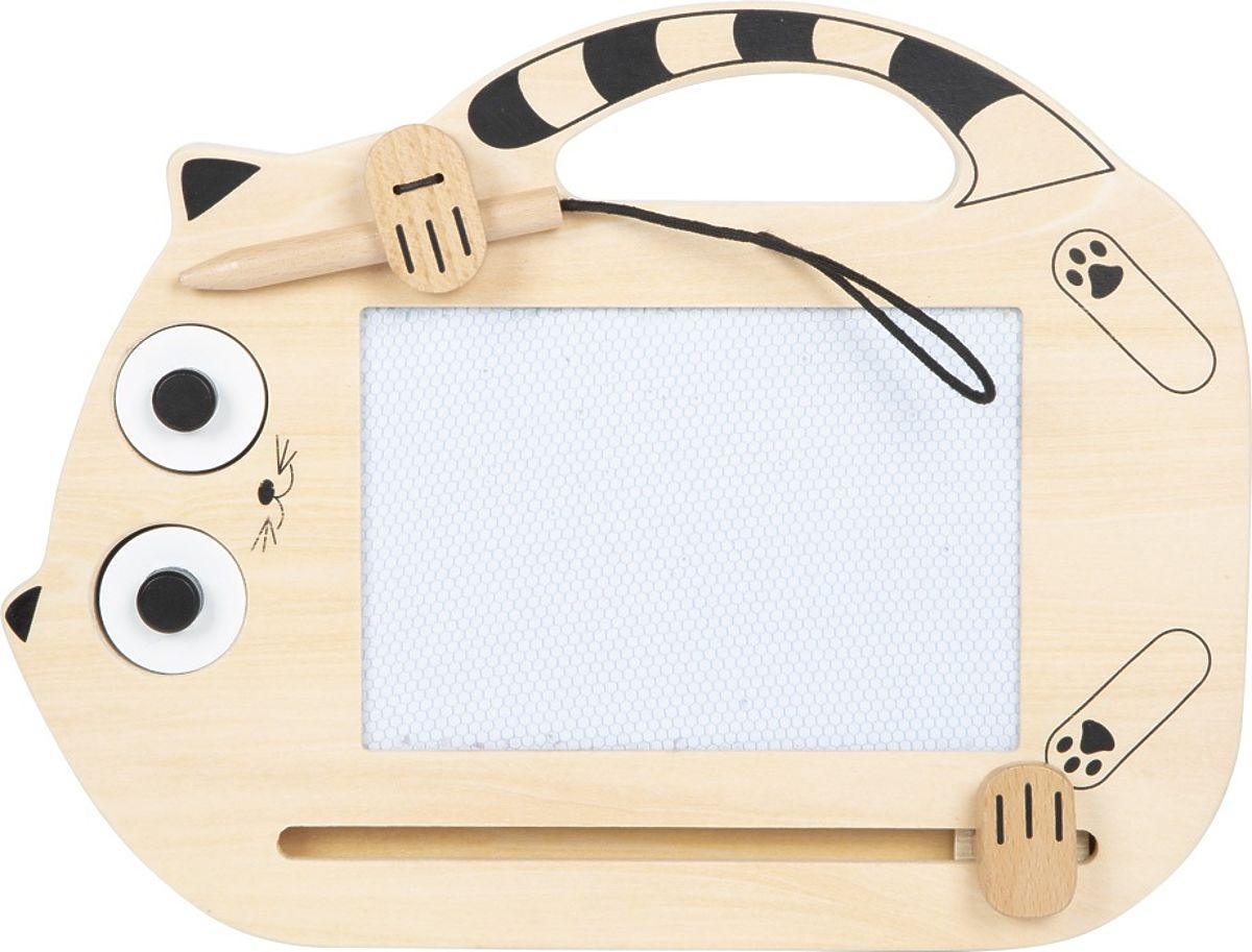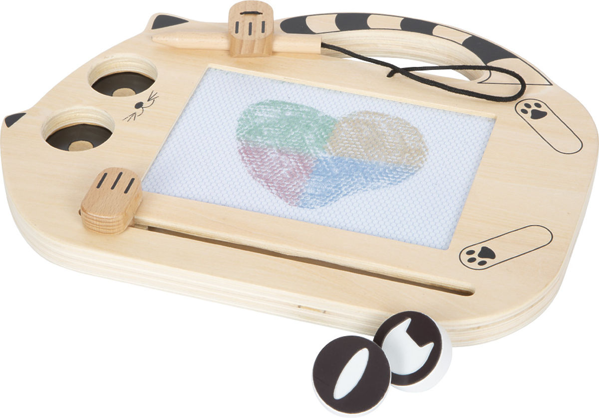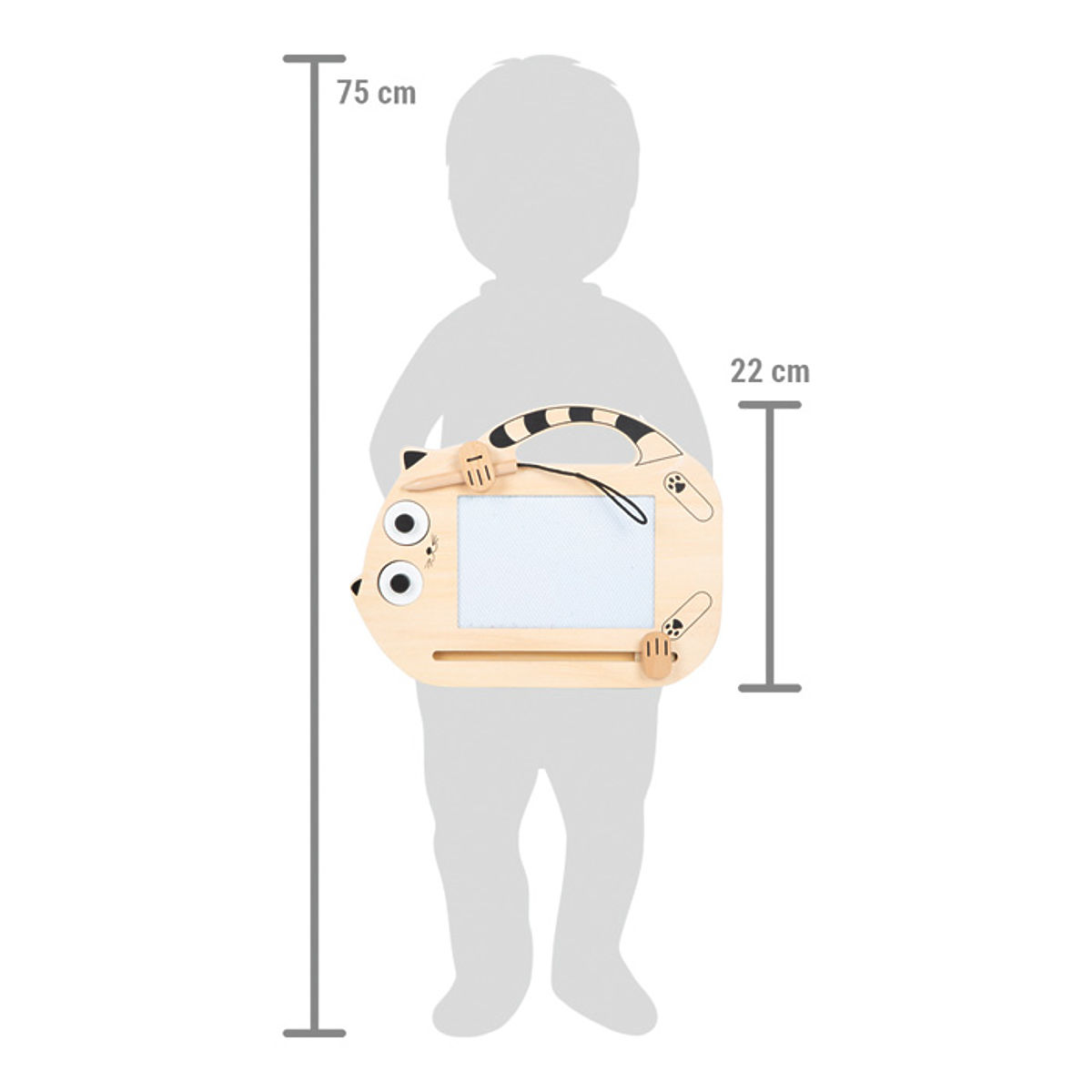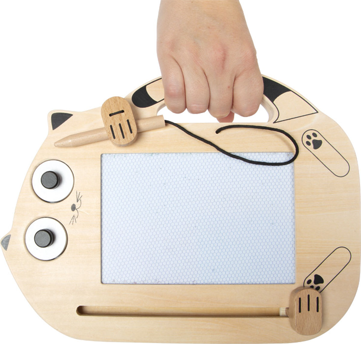 Kreatywna zabawa dla małych artystek i artystów! Magnetyczna tablica do rysowania w kształcie kota jest idealna dla dzieci, które uwielbiają rysować. Za pomocą pióra można tworzyć nowe obrazki w kółko. Dwa stemple z motywami kocich oczu i kociej głowy oferują dodatkowe możliwości tworzenia unikalnych dzieł sztuki. Kiedy pióro nie jest używane, można je bezpiecznie umieścić pod kocią łapką, a dzięki temu, że jest przymocowane do tablicy sznurkiem, nie zgubi się. Gdy dzieło jest gotowe lub chcesz stworzyć coś nowego, obraz można łatwo usunąć za pomocą suwaka – wszystko jest gotowe do kolejnej twórczości w mgnieniu oka! Dzięki zintegrowanemu uchwytowi do przenoszenia i kompaktowym wymiarom tablicę można zabrać wszędzie. Ciesz się kreatywną zabawą, która nie kończy się nawet w podróży! Główne cechy: z drewnianym piórem i 2 stemplami, pióro przymocowane sznurkiem do tablicy pod łapką, nieskończone rysowanie z magiczną gumką, z uchwytem do przenoszenia, wykonane z wysokiej jakości drewna, odpowiednie również na podróże