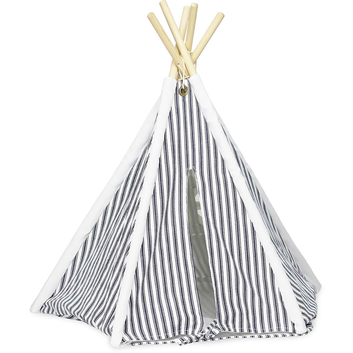 Piękne tipi w paski w mini wersji, idealne dla lalek. Drewniana podstawa z tekstylnym pokryciem jest łatwa do złożenia. Tkanina jest ciemnoszara i biała. Główne cechy: tipi dla lalek, solidna konstrukcja