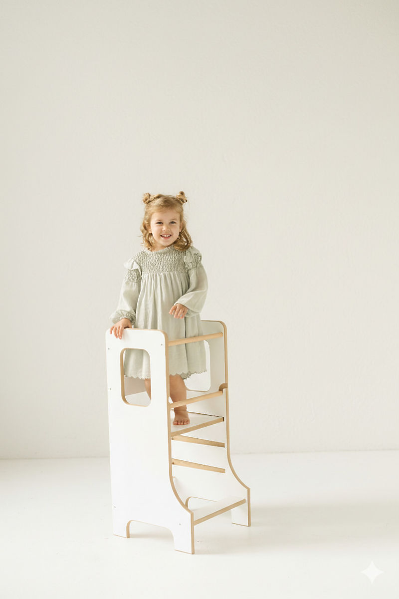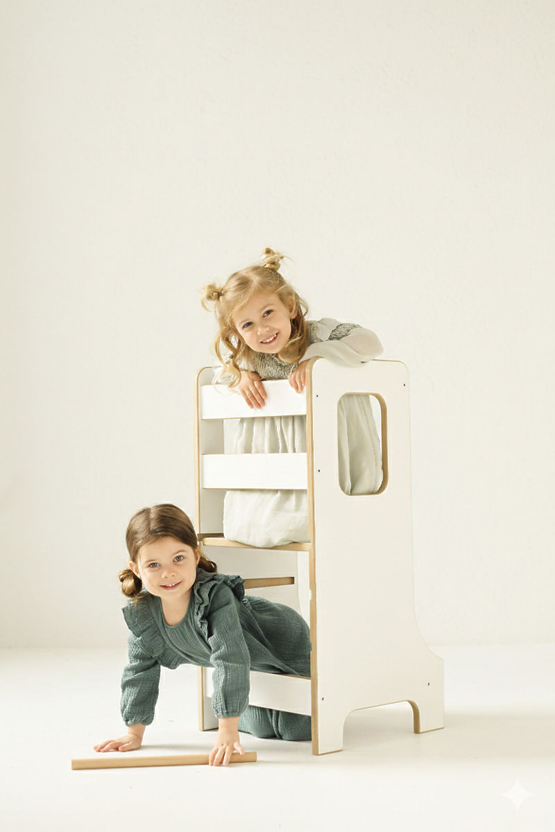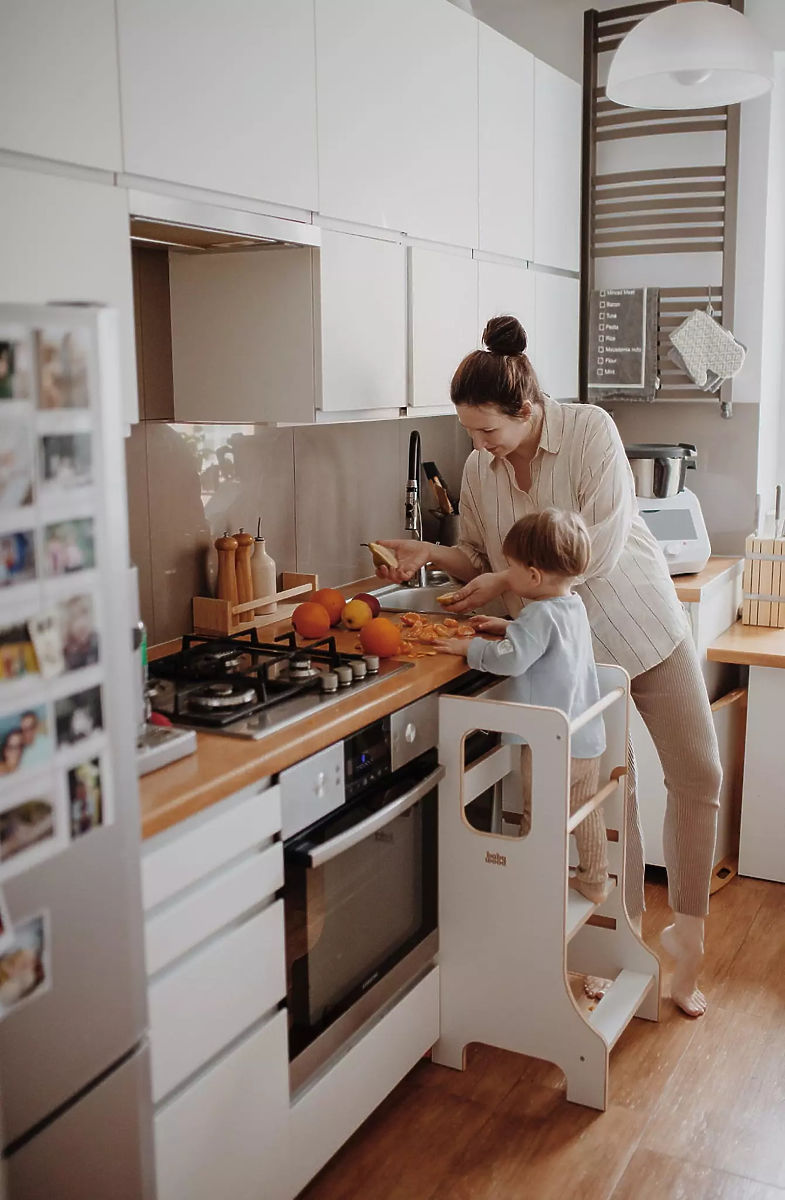Wieża edukacyjna SLIM w białym kolorze to idealny wybór dla rodziców, którzy chcą bezpiecznie zaangażować dzieci w codzienne domowe czynności i umożliwić im aktywne odkrywanie otaczającego świata. Dzięki swojej przemyślanej konstrukcji wspiera samodzielność, kreatywność oraz rozwój umiejętności motorycznych i pomaga dzieciom naturalnie zdobywać nowe doświadczenia. Wspólne chwile spędzone przy gotowaniu lub innych aktywnościach stają się zabawnymi i wartościowymi momentami. Smukła wersja SLIM wygląda elegancko i nie zajmuje zbyt wiele miejsca, ale wciąż pozostaje stabilna i bezpieczna. Dzieci mogą samodzielnie wchodzić i schodzić z wieży, co wzmacnia ich pewność siebie i niezależność.