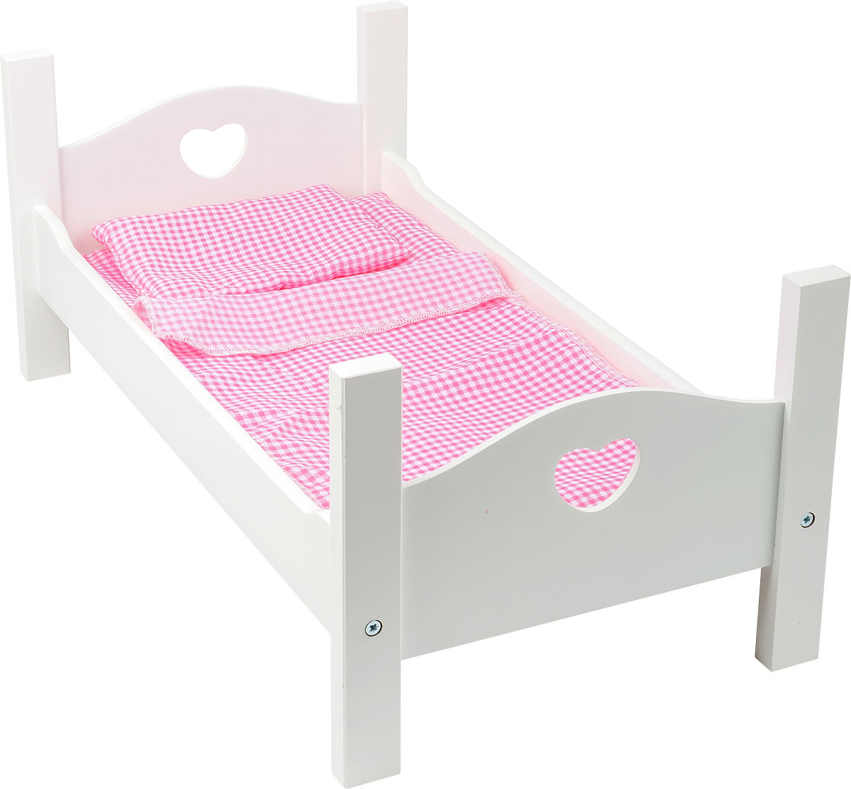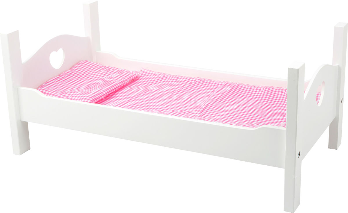 W tym łóżeczku lalka lub pluszak będą spać słodko! Nowoczesne drewniane łóżeczko w białym kolorze z detalami serduszek na zagłówkach. W zestawie znajduje się poduszka, koc i prześcieradło. Doskonały dodatek do zestawu mebli dla lalek. Główne cechy: dla lalek do wielkości 45 cm, w tym pościel
