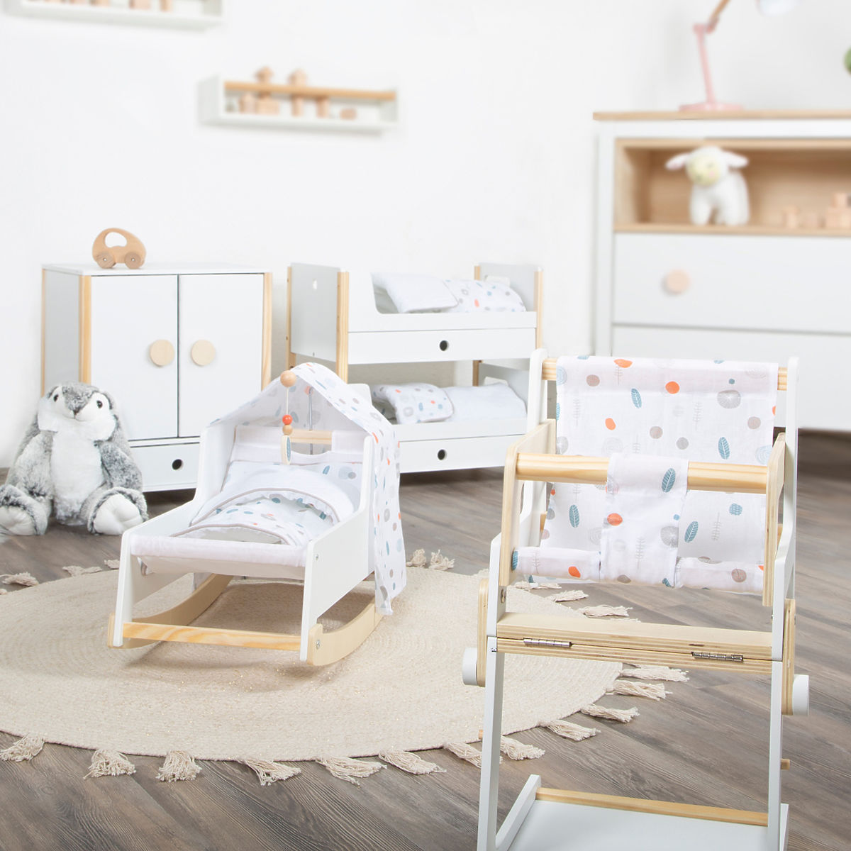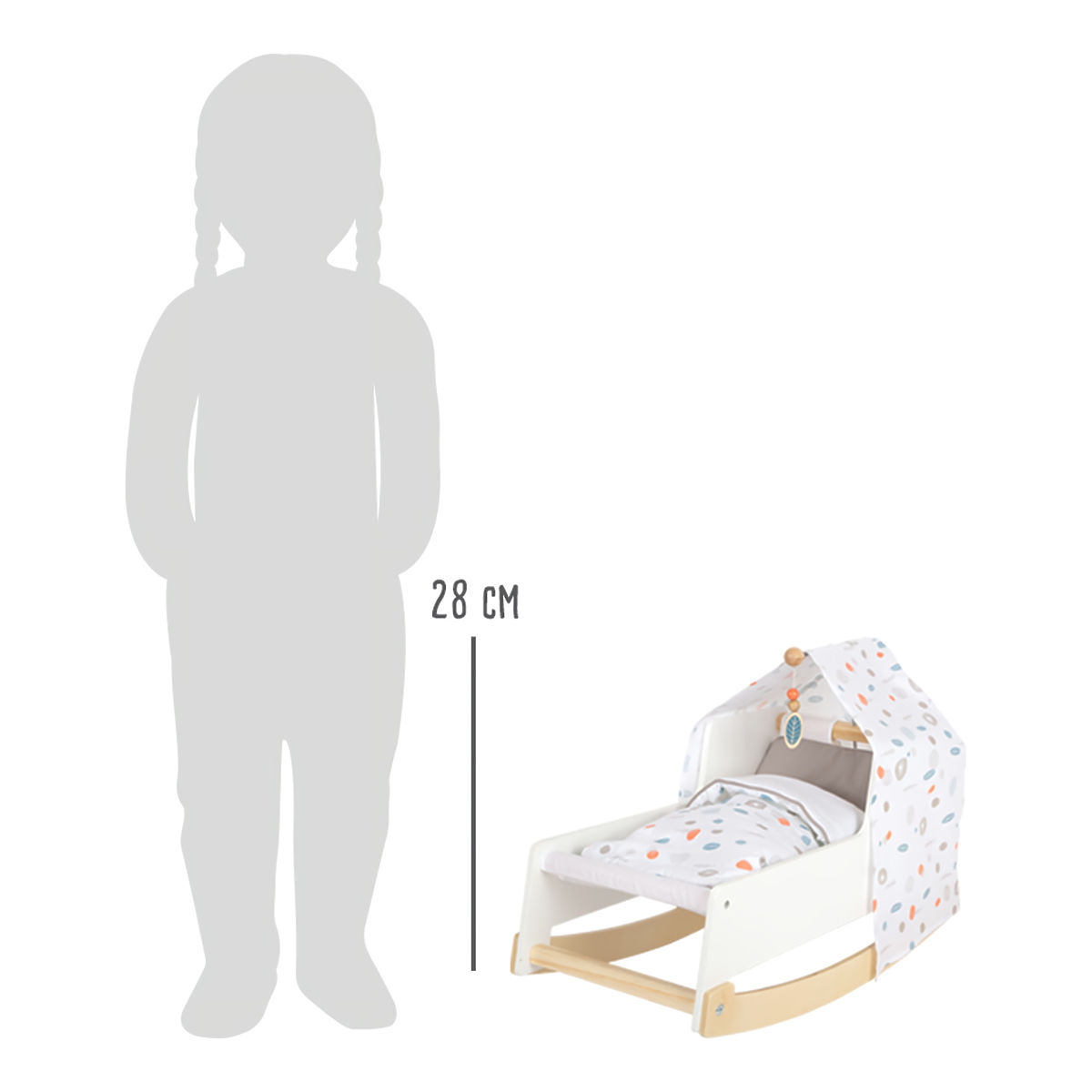 Lalki też potrzebują spać! Ta nowoczesna kołyska w skandynawskim stylu jest neutralna pod względem płci, ma dwustronną pościel, a pod dużą kołdrą mogą spać lalki i pluszaki do 46 cm. Dolna część tzw. płozy kołyski są odłączalne, podobnie jak baldachim. Wysokiej jakości, stabilna konstrukcja, zaokrąglone krawędzie, widocznie z drewna... Doskonała zabawka do każdego pokoju dziecięcego. Główne cechy: kołyska i łóżeczko w jednym, baldachim i zawieszka, płozy i baldachim można oddzielić, stabilna konstrukcja, wysokiej jakości materiały, neutralna pod względem płci pościel, oversize'owa kołdra, zaokrąglone krawędzie, widocznie drewniana, dla lalek i pluszaków do 46 cm, skandynawski liniowy design, delikatne kolorowe tony. Little Button Seria atrakcyjnych akcesoriów dla lalek Little Button oferuje szeroką gamę produktów, od wózka przez krzesełko do karmienia aż po szafę. Klienci łatwo zwrócą uwagę na jednolity funkcjonalny i subtelny design wykorzystujący proste linie i stonowane neutralne kolory. Dzięki temu mogą stworzyć spójne harmonijne zestawy, które gustownie uzupełnią nowoczesne wnętrze. Przemyślana konstrukcja i wysokiej jakości wykonanie pomagają zapewnić wysoką stabilność, bezpieczeństwo i długą żywotność. Za ich pomocą stwórz stylowy kącik dla lalek, gdzie Twoje dzieci mogą rozwijać swoją wyobraźnię i umiejętności opiekuńcze.