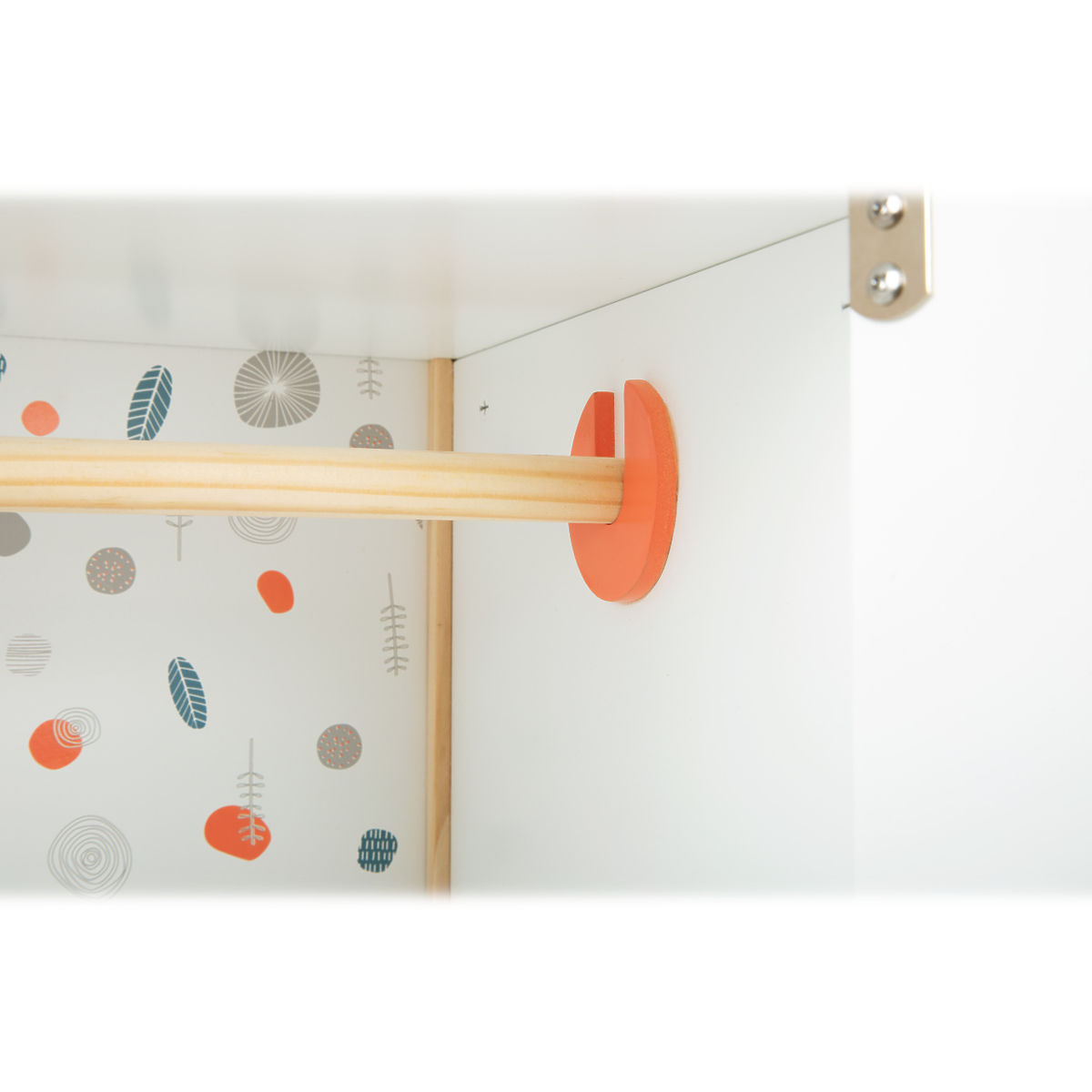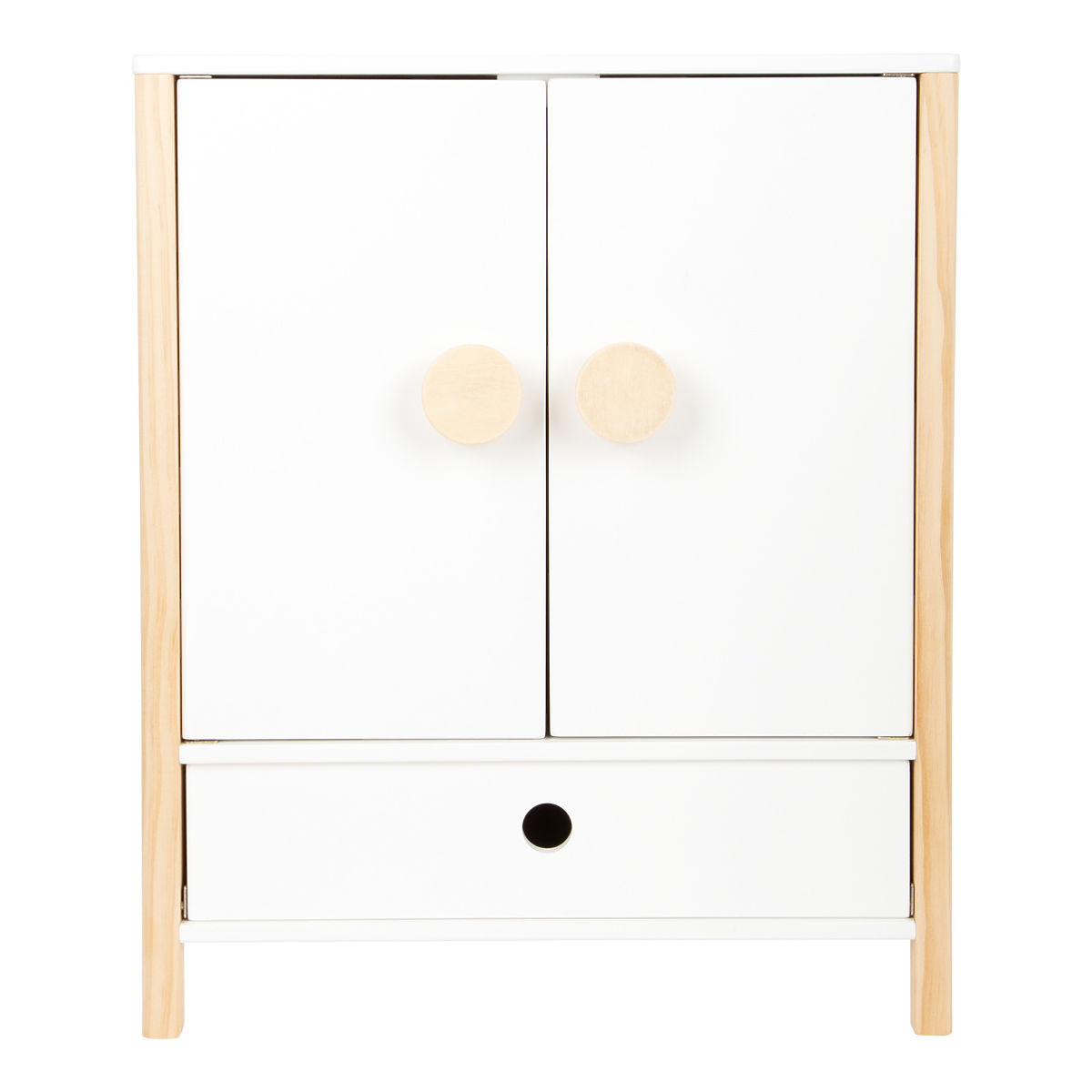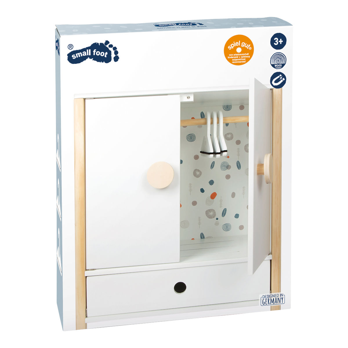 Wszystkie ubranka dla lalek pod ręką. Przestronna drewniana szafa zrobi wrażenie na każdym z Was nie tylko dzięki łatwo otwieranym drzwiom. Prosty skandynawski design, wewnątrz delikatne kolorowe tony. Po otwarciu szafy znajdziecie na drążku wieszaki, a także oddzielne półki i szufladę. Możecie przechowywać wszystkie ubranka według własnego gustu, możecie także użyć własnych wieszaków. Dzięki tej zabawce dzieci nauczą się, jak ważne jest utrzymanie porządku oraz jak dbać o własne ubrania, aby służyły nam jak najdłużej. Główne cechy Przestronna drewniana szafa Łatwo otwierane drzwi Drążek na ubrania, wieszaki, szuflada Zaokrąglone krawędzie, widocznie drewniana Neutralny kolor Skandynawski liniowy design Little Button Seria atrakcyjnych akcesoriów dla lalek Little Button oferuje szeroką gamę produktów, od wózka przez krzesełko do karmienia aż po szafę. Klienci łatwo zostaną zauroczeni jednolitym funkcjonalnym i subtelnym designem wykorzystującym proste linie i stonowane neutralne kolory. Dzięki temu mogą tworzyć spójne harmonijne zestawy, które gustownie uzupełnią nowoczesne wnętrze. Przemyślana konstrukcja i wysokiej jakości wykonanie pomagają zapewnić wysoką stabilność, bezpieczeństwo i długą żywotność. Stwórzcie z ich pomocą stylowy kącik dla lalek, gdzie Wasze dzieci mogą rozwijać swoją wyobraźnię i umiejętności opiekuńcze.