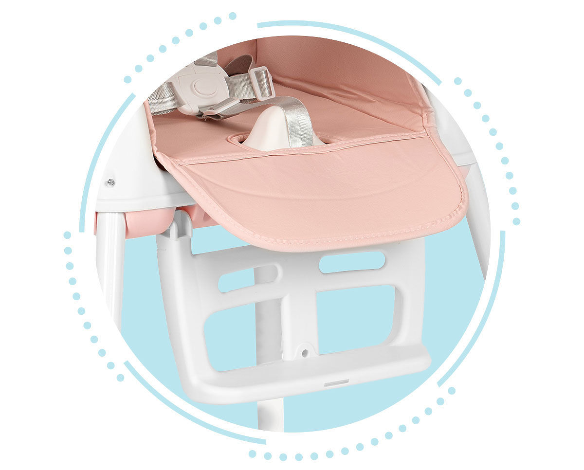 KRZESEŁKO 3w1Krzesełko umożliwia zmianę wysokości. Łatwo można zdemontować nogi i podnóżek, dzięki czemu z wysokiego krzesełka powstaje niższe krzesełko. Unikalnym elementem krzesełka jest jego siedzisko, które można używać na krześle jadalnianym lub kuchennym. W zestawie znajdują się specjalne paski mocujące do siedziska i oparcia tradycyjnego krzesła.