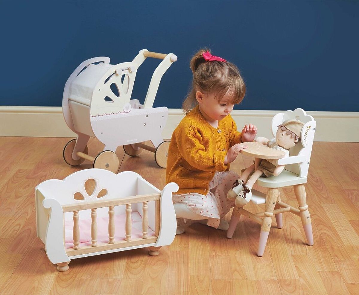 Piękne drewniane krzesełko jest idealne do zabawy w role! Odpowiednie dla pluszaków i lalek o wielkości około 35 cm, inspiruje młode mamy i tatusiów do kreatywnej zabawy. Wykonane z trwałego i zrównoważonego drewna kauczukowego, bez plastiku, prawdziwa eko zabawa! Krzesełko ma wiele detali, ozdobne nogi, designerskie wycięcia w oparciu, złote kwiatowe zdobienia. Do praktycznego wyposażenia należy podnóżek i tacka. Naprawdę realistyczne krzesełko do karmienia dla głodnych zabawek. Do krzesełka doskonale pasuje łóżeczko Sleigh i wózek Sweet Dreams, które znajdziesz w zakładce „akcesoria”. Zabawki z celem Wszystkie zabawki firmy Le Toy Van są wykonane z myślą o długowieczności. Projektowane z miłością przez doświadczonych rzemieślników przy użyciu etycznych praktyk i zrównoważonych materiałów, które są przyjaźniejsze dla naszej planety. Główne cechy: krzesełko dla lalek odpowiednie dla zabawek o wielkości 30-35 cm wykonane etycznie z zrównoważonego drewna nie zawiera plastiku testowane zgodnie z najsurowszymi standardami malowane nietoksycznymi farbami na bazie wody inspiruje do kreatywnej zabawy wspomaga rozwój umiejętności społecznych i językowych po rozpakowaniu wymaga złożenia zgodnie z instrukcją Nagrody zabawki: Good Toy Guide Recommended Kolekcja Honeybake: Zabawki w tej kolekcji są odpowiednie do odkrywania, pomagają dzieciom w rozwijaniu wyobraźni, umiejętności społecznych i werbalnych oraz funkcji poznawczych. Tradycyjny design z nowoczesnymi detalami z pewnością spodoba się dzieciom. Honeybake to kolekcja Le Toy Van, która zdobyła najwięcej nagród za design, jakość, bezpieczeństwo oraz wartość edukacyjną i zabawową.