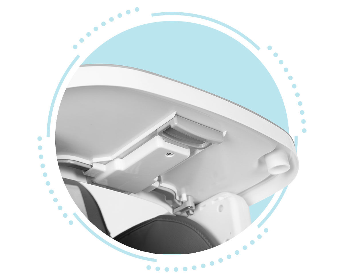 PEŁEN KOMFORTTaca ma regulację odległości względem oparcia, wystarczy użyć dźwigni znajdującej się na jej spodzie i przesunąć ją. Jej zaletą są dwie warstwy i profilowane krawędzie, które zapobiegają upadkowi jedzenia na podłogę.