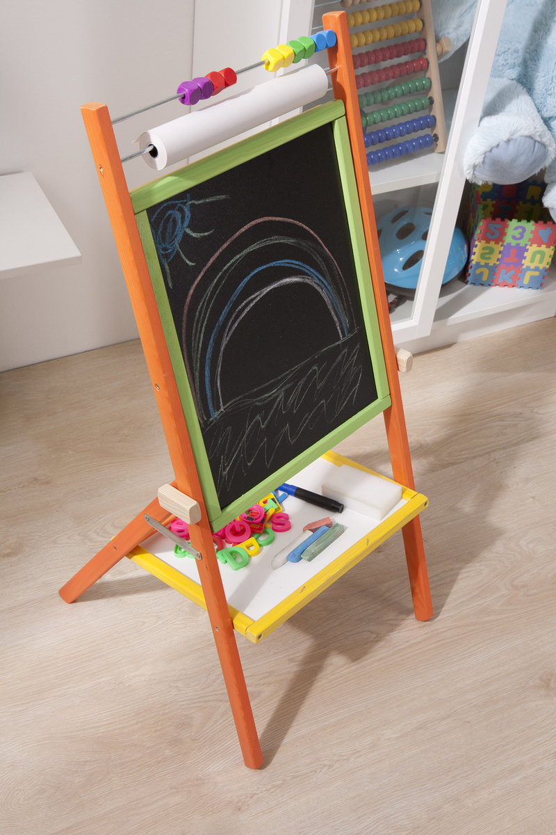 Czarna strona pełni funkcję tablicy kredowej, biała może być zapisana markerami. Zaletą tej deski jest możliwość jej komponowania, dzięki czemu zajmuje mało miejsca podczas przechowywania. Dodatkowo zastosowano pomysłowy system zapinania, który pozwala na obrócenie deski do właściwej pozycji względem dziecka, które będzie wtedy wygodniej pisać lub rysować.
