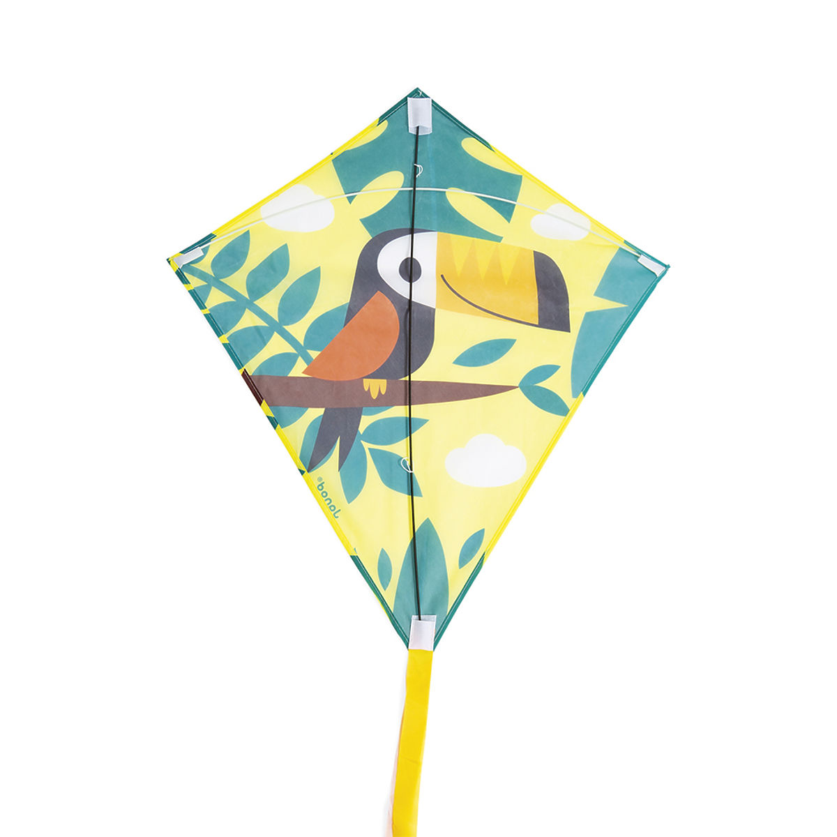 Ten latający latawiec ma klasyczny trójkątny kształt z kolorowym nadrukiem tukana, dzięki czemu jest atrakcyjny i zabawny dla dzieci. Długi kolorowy ogon i długa linka z rączką pozwalają na łatwe sterowanie latawcem i ciekawe manewry w locie.