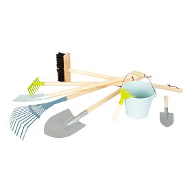 Ten wszechstronny zestaw narzędzi ogrodniczych w nowoczesnych kolorach składa się z łopaty, łopaty, grabi, miotły, łopaty i dwóch małych narzędzi ogrodniczych do prac ogrodniczych. Po zakończeniu pracy solidne narzędzia z drewna i metalu można odpowiednio zawiesić na praktycznych pętlach.
